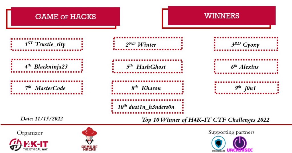 out of the top 3 we managed to acknowledge the top 10 winners of the CTF