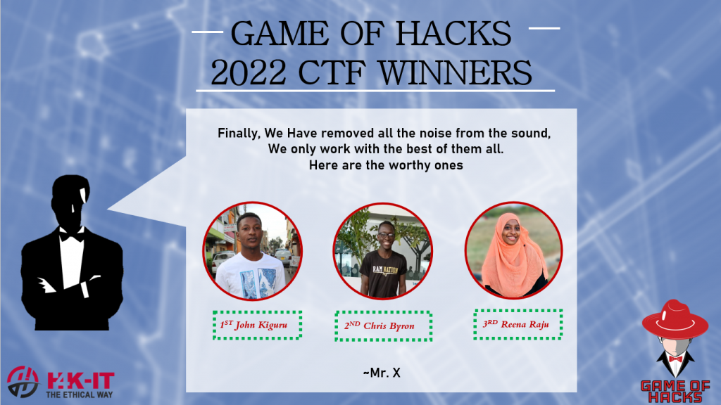 The CTF started on 11/14/2022 and ended on 11/15/2022 and we managed to get 3 winners of the competition. out of the 3 winners one of the top 3 winners was a woman.