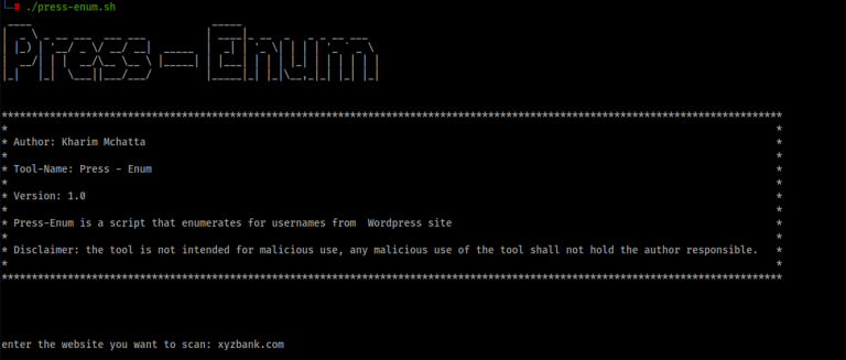 Before running the tool first of all you are supposed to download figlet by typing “apt-get install figlet”, once done you can change mode of the script and make it executable if its not by typing “chmod + x press-enum.sh”. once done is when you run the tool and you will be asked to enter the URL of the website you want to scan.
